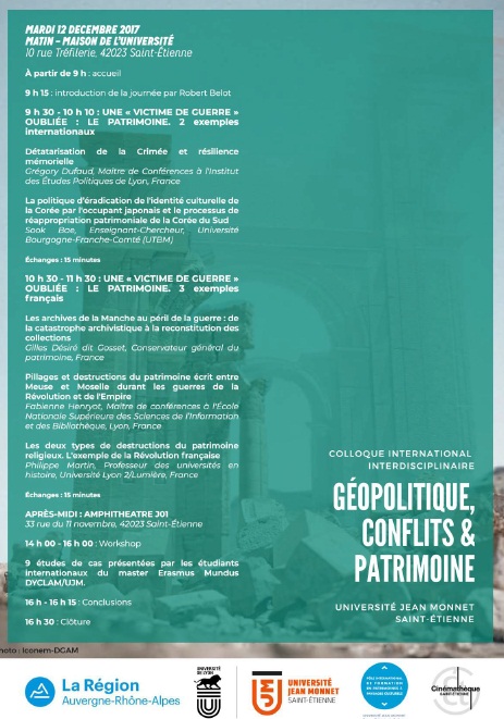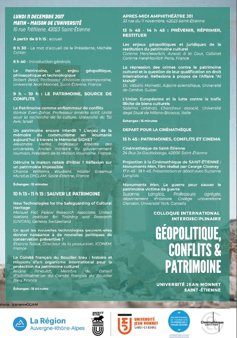 Ci-dessous le programme du colloque international, interdisciplinaire „Géopolitique, conflits et patrimoine” qui aura lieu à l’Université „Jean Monnet” de Saint-Etienne le 11 et 12 décembre prochain et auquel notre association participe. Ce colloque, financé par la région Auvergne-Rhône-Alpes, est organisé par le professeur Robert Belot, membre de notre association et je présente une communication intitulée: „Un patrimoine encore interdit? L’enjeu de la mémoire du communisme en Roumanie aujourd’hui à travers le „Mémorial Sighet„.